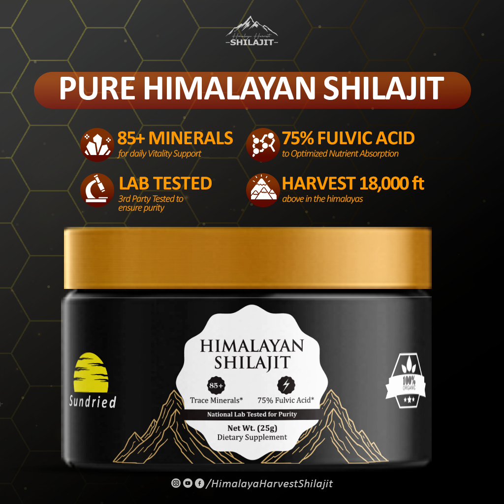 Discover the ancient power of Pure Himalayan Shilajit Resin from Himalaya Harvest, crafted to elevate your energy, vitality, and overall well-being. This organic Shilajit resin is packed with over 85+ trace minerals and a high concentration of Fulvic Acid, offering a natural way to detoxify, boost your stamina, and support your immune system.